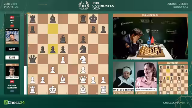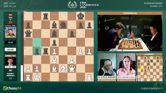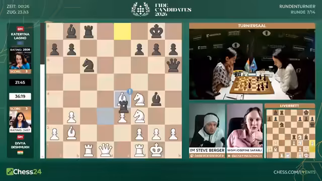 00:13:42Der Stream startet mit einer Begrüßung zur siebten Runde des Kandidatenturniers 2026. Der Kommentator, Josefine, ist wieder an seiner Seite und erläutert die Ausgangslage: Acht Spieler im Open und acht Spielerinnen bei den Frauen kämpfen in Zypern um den Titel. Der Gewinner darf den amtierenden Weltmeister Gukesh beziehungsweise Ju Wenjun herausfordern. Die Spannung steigt, da es für einige die letzte Chance auf den Turniersieg sein könnte, während andere bereits in Führung gehen.