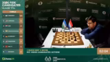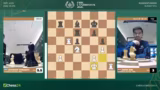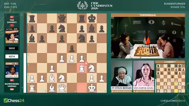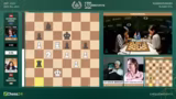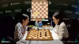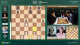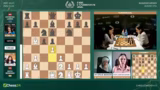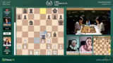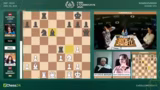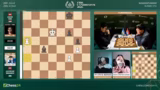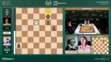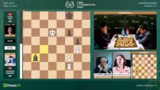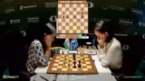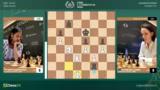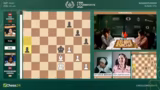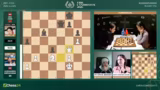 02:53:36Eine dramatische Entwicklung im Frauenfeld zwischen Anna Muzychuk und Bibisara Assaubayeva. Muzychuk opfert einen Bauern mit Dame H6, was als kritischer Fehler eingestuft wird. Sie verliert sofort die Qualität und sieht sich plötzlich in einer verlorenen Stellung wieder. Kommentator Hikaru Nakamura vermutet, dass der Zug aus der Analyse kam und sich nicht bewährt hat. Die Kommentatoren diskutieren die Abwicklung und stellen fest, dass die aktiven weißen Figuren eine starke Stellung aufweisen, die jedoch nicht mehr zu einem Sieg umgewandelt werden kann.