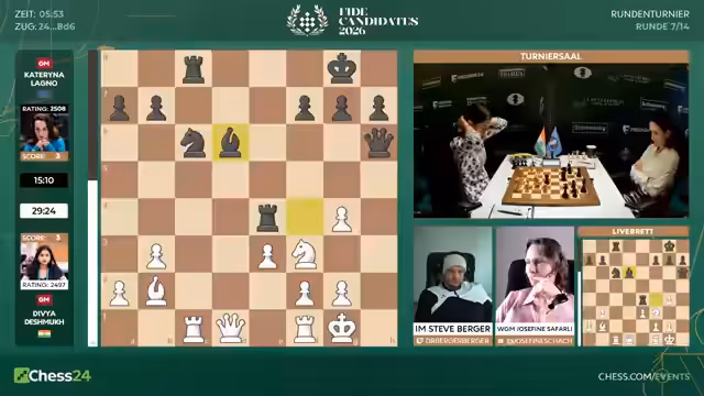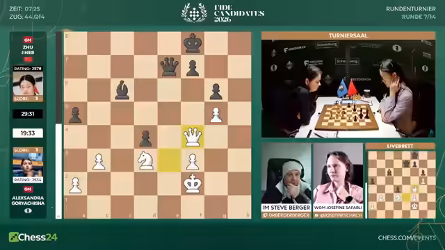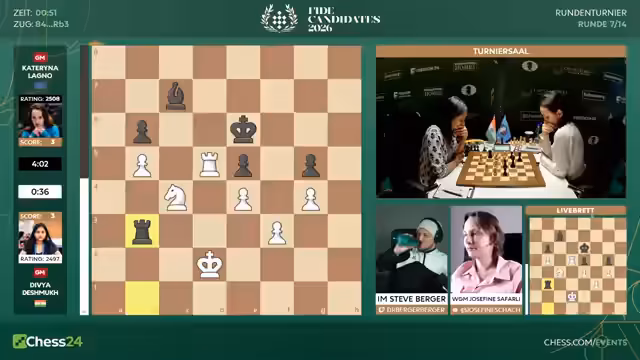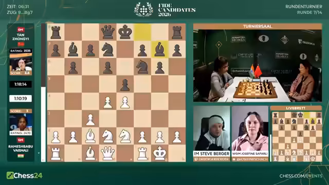 03:51:26Bei den Frauen erlebt Tan Song Ji einen katastrophalen Partieabbruch. Sie hat eine nominale Gewinnstellung, aber unter Zeitnot spielt sie einen groben Fehler, der sofort zum Matt führt. Kommentator Jan ist baff und kritisiert das Einstellen von Gewinnpositionen scharf. Das Verhalten wird als unprofessionell und insbesondere beim Kandidatenturnier als inakzeptabel bezeichnet. Es wird als heftiger Rückschlag für die Spielerin gewertet.