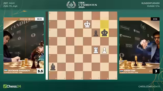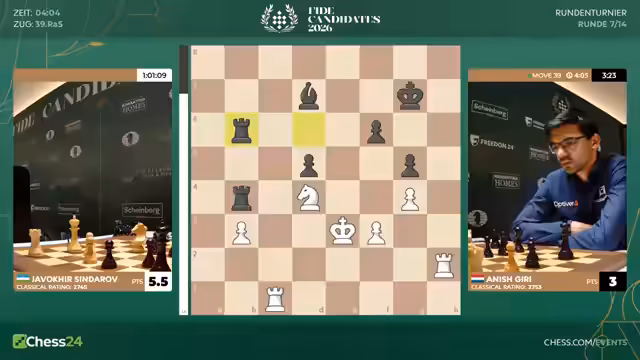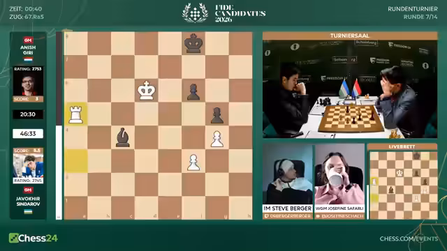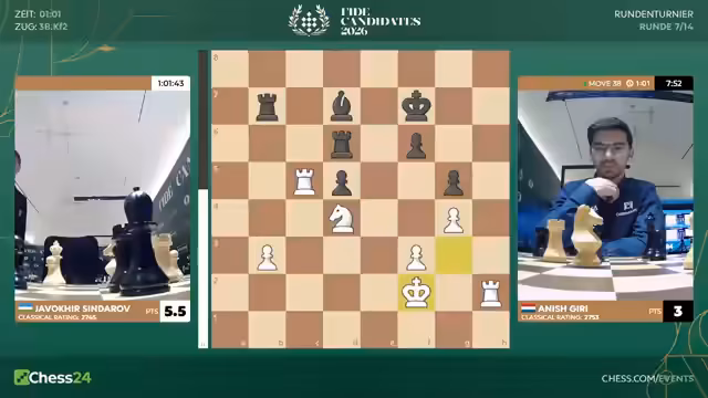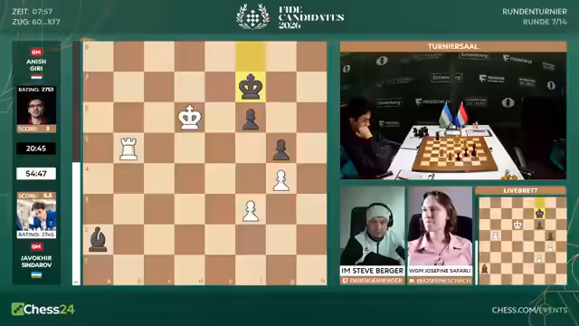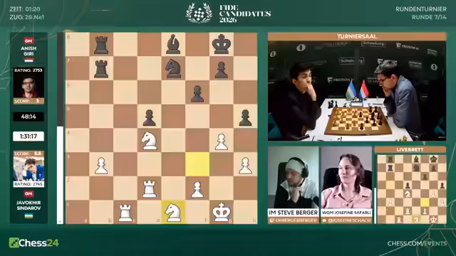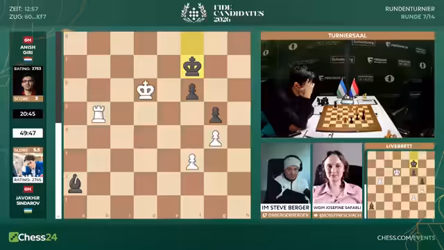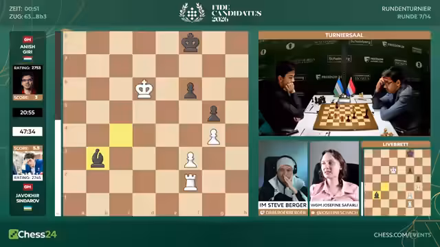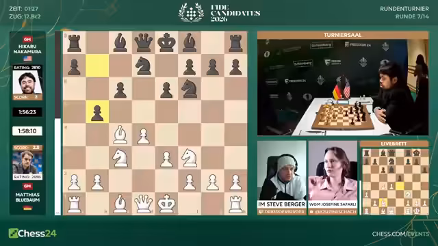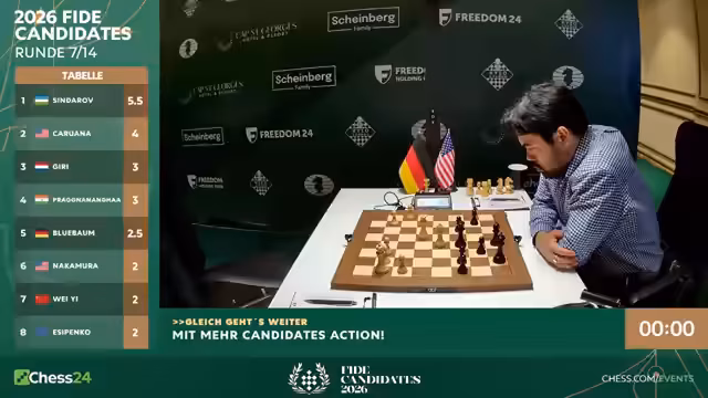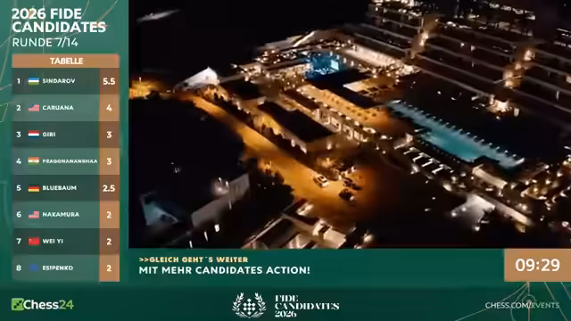 Nach sieben Runden des Kandidatenturniers 2026 liegt Sindarov an der Spitze. Hikaru Nakamura mit nur 3,5 Punkten hat es schwer. Gegen ihn spielt Matthias Blübaum, der mit einer ungewöhnlichen Eröffnung eine gute Chance hat, Nakamura aus der Ruhe zu bringen und eventuell zu punkten.