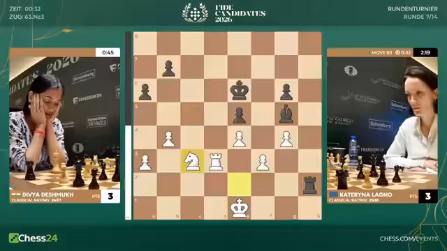 06:32:15Nach der langen Partie werfen die Kommentatoren einen abschließenden Blick auf die aktuelle Situation im Turnier. Anna Muzychuk führt mit 4,5 Punkten. Tan Zhongyi und Bibisara Assaubayeva haben minus 1 bzw. minus 2 Punkte, was zeigt, wie eng die Platzierungen und die Leistungen der Teilnehmerinnen beieinander liegen. Dies unterstreicht den dramatischen Verlauf und die Ungewissheit des gesamten Kandidatenturniers.
