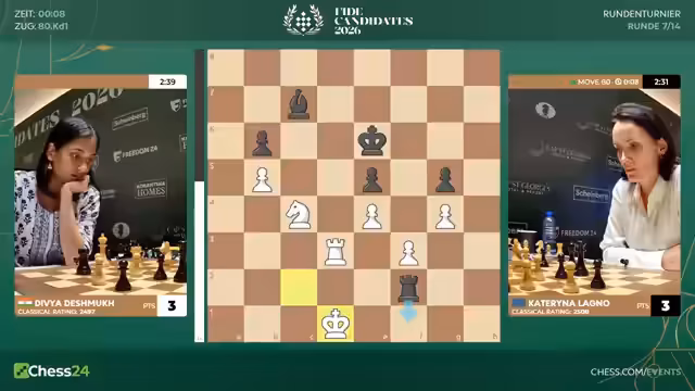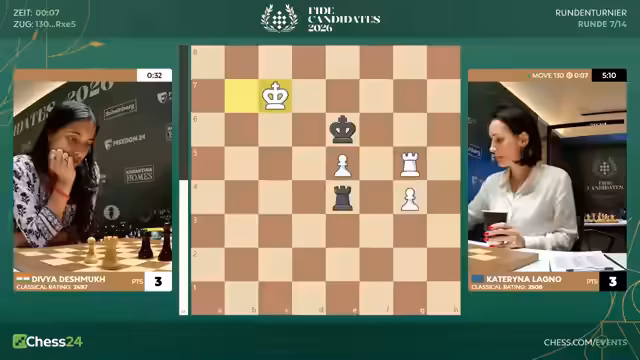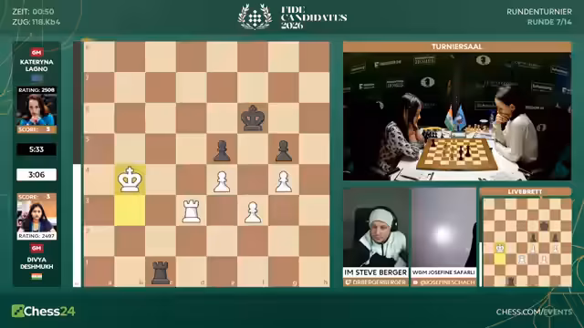 05:50:23Die Partie zwischen Lagno und Dewey zieht sich über eine sehr lange Phase des scheinbar unentschiedenen Endspiels hinaus. Kommentatoren und Spielerin selbst erkennen, dass die Stellung wahrscheinlich remis ist, aber Dewey weigert sich, ein Remis anzunehmen. Sie probiert verschiedene Varianten, um einen unwahrscheinlichen Sieg zu erzielen. Dies führt zu einer langen Phase der Stellungswiederholung und zähen Verteidigung von Lagno auf der anderen Seite.