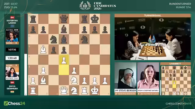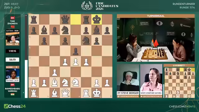 00:59:19Der Stream wechselt zu den Partien der Frauen. Die Anordnung der Figuren bei Anna Musitschuk gegen Bibisara Ashepteva deutet auf eine ungewöhnliche Variante des Sizilianischen Damengambits hin. Bibisara, nach zwei Niederlagen in Folge, scheint trotzdem unbeeindruckt zu spielen. In der Partie zwischen Ju Wenjun und Sujina wird der Aufbau als sehr solide beschrieben, während Devia gegen Lagno im Keimer-System eine strategische Idee verfolgt, die aber auch nicht überraschend wirkt. Die Frauen spielen unter einem etwas anderen Zeitkontrollsystem.