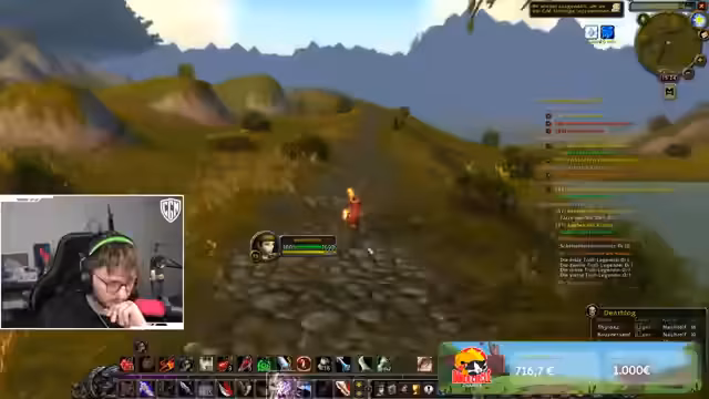 08:18:56Erkundung von Nebenquests wie 'Auftragsmördervertrag' und Yeti-Sammelmissionen im Hügelland. Parallel läuft eine Diskussion über Server-Preise für Level-60-Hardcore-Charaktere (150-200€). Der Spieler farmt Ressourcen ('Yeti-Fell'), bespricht Paladin-Spell-Updates und koordiniert Gruppenzusammenstellung mit Fokus auf Mage-Support. Warteschleifen während der Vorbereitungen werden mit Unterhaltung über Serien ('The Boys') überbrückt.