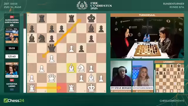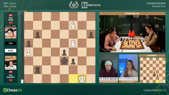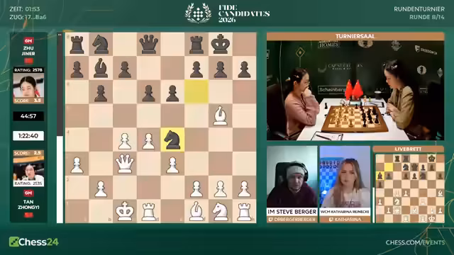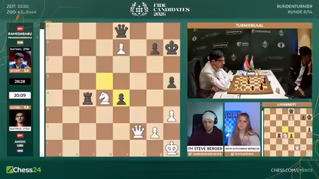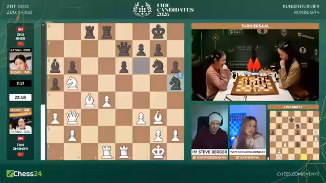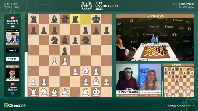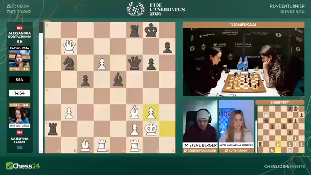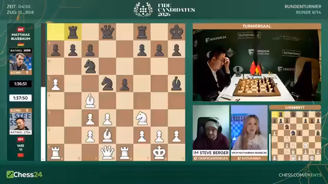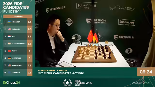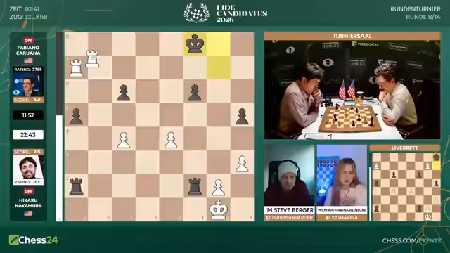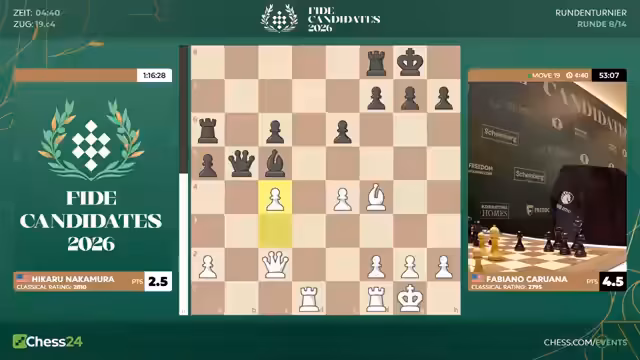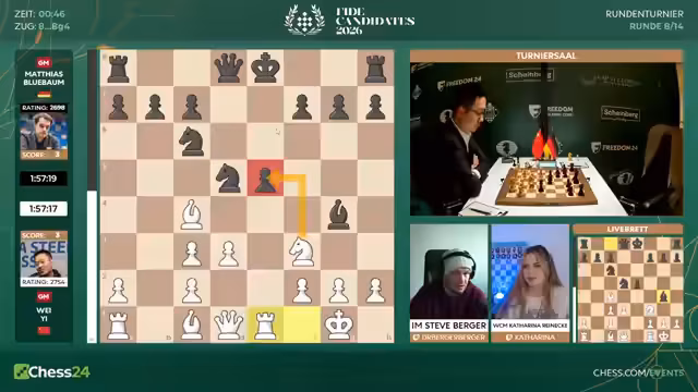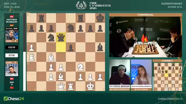 Mit dem Start der achten Runde beginnt für die Spieler die entscheidende zweite Hälfte des Kandidatenturniers 2026. Fabiano Caruana hat mit 6,5 aus 7 einen historischen Start hingelegt. Er geht als klarer Favorit ins Rennen. Spieler wie Hikaru Nakamura sind unter starkem Druck und müssen fast nur noch gewinnen. Matthias Blübaum trifft auf Wei Yi und ist dabei, seine Aufholjagd zu starten.