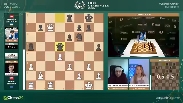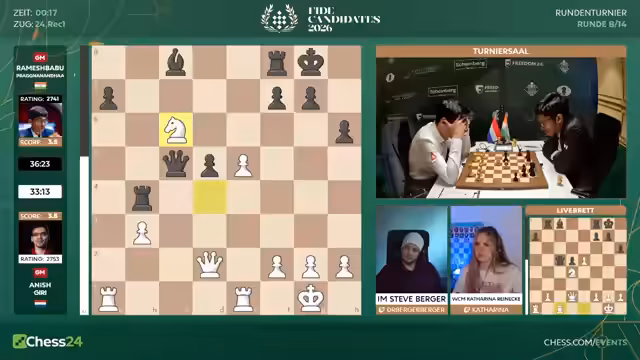 00:22:24Es wird erwartet, dass sich das Spiel aller Teilnehmer in der zweiten Turnierhälfte radikal verändert. Die erste Hälfte sei vorbei und es gehe nun um alles oder nichts. Spieler wie Hikaru Nakamura müssen fast durchgehend gewinnen, um überhaupt noch Chancen auf den Turniersieg zu haben, während sich Caruana als Favorit positioniert hat. Dieser Mindshift führt zu riskanterem Spiel und der Annahme, dass mehr eröffnungstechnisch Wagnis eingeht wird, um Partien zu erzwingen und nicht nur Remis zu spielen.