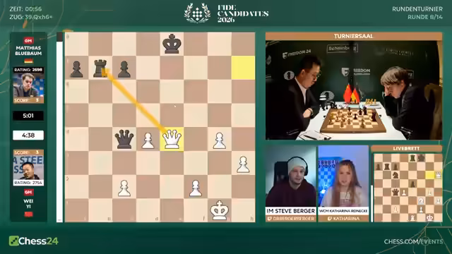 04:53:19Die Partie zwischen Matthias Blübaum und Wei Yi entwickelte sich zu einem dramatischen Endspiel. Nachdem Giri seine Partie gewonnen hatte, stand auch Blübaum unter Zeitdruck. Trotzdem durchrechnete er die Stellung blitzschnell und erkannte, dass er durch einen Zug mit König E7 in eine Remisstellung via Zugwiederholung kommen musste. Weiß hatte eine Figur weniger, aber Blübaum spielte souverän und erzwang das Unentschieden. Es war ein faires Ergebnis in einer sehr spannenden Partie.
