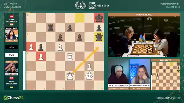 04:45:29Im Frauenfeld kam es zu vielen aufregenden Entwicklungen. Während bei Anna Musischuk gegen Divya Darpan ein Vorteil für Weiß schien, wurde dieser durch einen suboptimalen Tausch des H6-Bauern verspielt. In der Konsequenz wurde Anna in ein schwieriges Damenendspiel gedrängt, das sie letztlich verlor. Auch Tan Zhongyi gegen Sujina Demina endete mit einer Niederlage für Tan, während Katharina Lagno gegen Vaishali Ramesh Babu gewinnen konnte und sich damit in die Spitzengruppe mit 4,5 Punkten spielte.