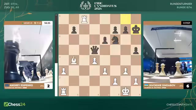 02:17:10Der Blick auf andere Partien zeigt, dass das Feld der Herausforderer noch offen ist. Bei Sindarov gegen Jesipenko hat Schwarz ein Bauernmeer, aber die schlechtere Leichtfigur. Jesipenko, als 'Alles-oder-Nichts'-Spieler, sucht weiter nach Chancen und vermeidet Remis-Angebote. Bei Hikaru Nakamura und Fabiano Caruana sieht es nach einer Remis-Stellung aus, doch Fabi wird wahrscheinlich versuchen, mit den schwarzen Steinen noch eine Chance auf den vollen Punkt zu wahren, da sein Turnierziel aus Sicht der Kommentare nicht mehr erreicht werden kann.