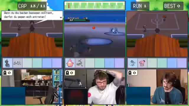 07:28:02Der Streamer und seine Mitspieler geraten in eine Diskussion über die Regeln von Story-Kämpfen. Einer von ihnen ist aus Versehen in einen Rivalenkampf gelaufen, was dazu führt, dass die anderen sofort nachkommen müssen. Der Streamer ist verärgert, weil einer seiner Mitspieler nicht ernst genug spielt und lacht, während andere noch kämpfen. Es wird betont, dass die Challenge nur ernst genommen werden sollte, wenn alle drei Spieler voll dabei sind und ihre Pokémon nicht leichtfertig opfern.