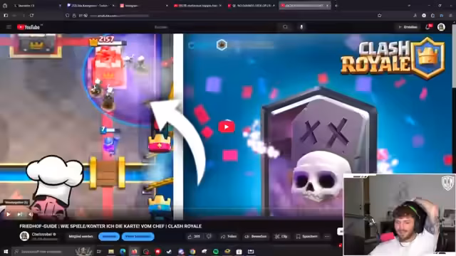 00:08:56Der Streamer spielt Clash-Royale-Spiele und äußert Frustration über die aktuelle Meta, insbesondere über das häufige Spielen von Mega-Ritter und Bomber-Decks. Er berichtet von Verlusten und Schwierigkeiten, bestimmte Karten zu kontern, und zeigt Verbitterung über seine eigene Leistung, die er als schwächer als in der Vergangenheit beschreibt. Er erwähnt auch seine Erfolge in der Vergangenheit, in denen er Top-100-Spieler in Deutschland war.