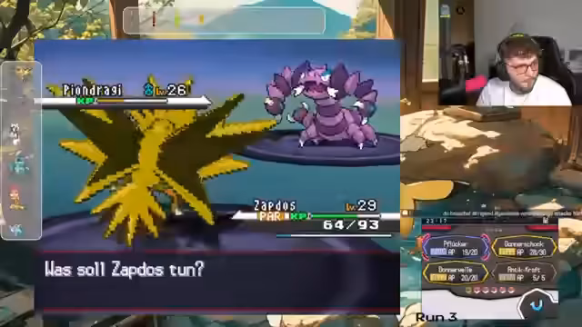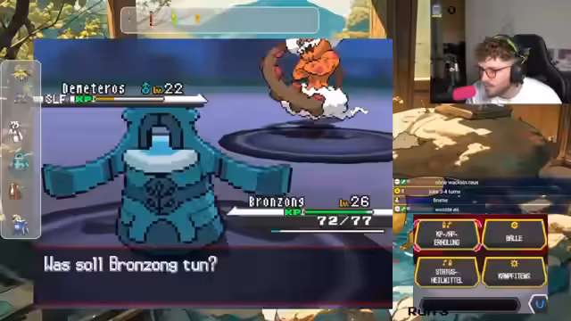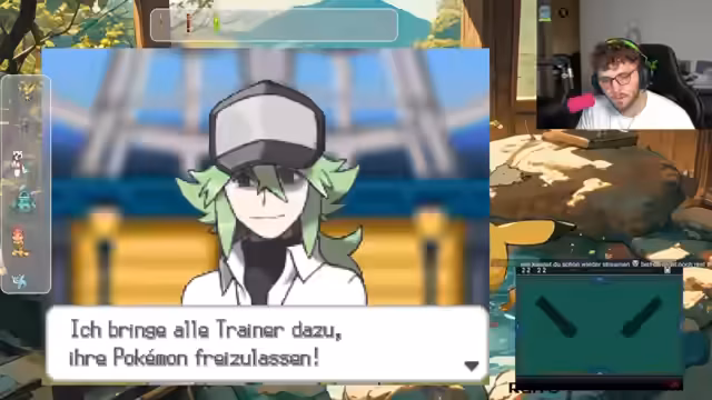 00:06:30Zurück im Spiel Pokémon Schwarz/Weiß kämpft der Streamer gegen einen Arenaleiter. Der Kampf verläuft holprig und er hat Schwierigkeiten, die Pokémon des Gegners effektiv zu bekämpfen. Er trifft auf unerwartete Attacken und Mechaniken, wie etwa Attacke abwehren, die er nicht versteht. Ein Pokémon des Gegners, Romsalat, steigert seine Statistik extrem stark, was den Streamer zur Aufgabe des Kampfes und zum Rückzug in die Kapsel zwingt, da seine Pokémon überleveln und sonst der Run gefährdet wäre. Er ist frustriert über die spielerischen Entscheidungen und die Level-Gap.