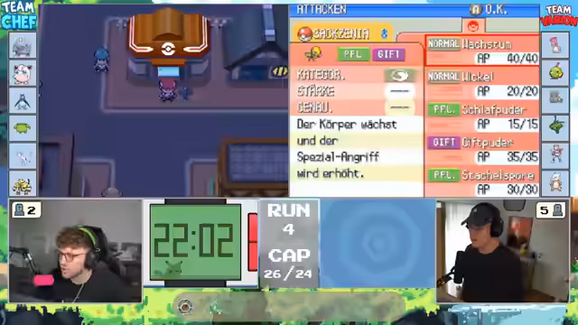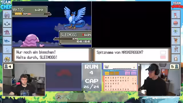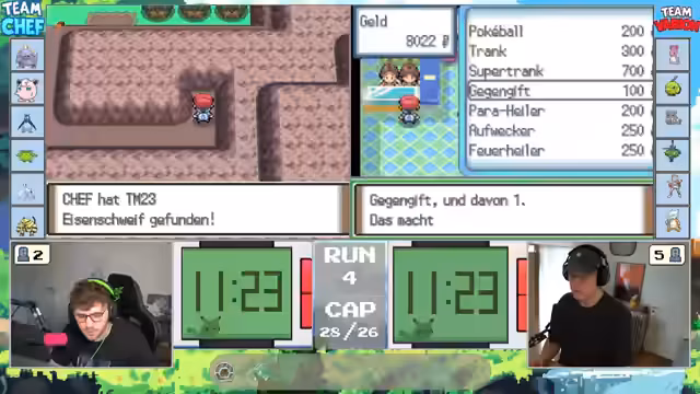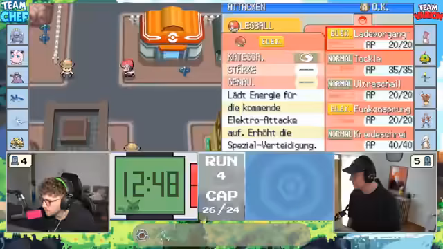 00:13:13Die Streamer stehen vor der Entscheidung, ob sie dem Pokémon Nocchan die Attacke 'Durchbruch' beibringen sollen. Sie diskutieren die Vor- und Nachteile der Attacke, die Schwächen des gegnerischen Teams und alternative Taktiken. Gleichzeitig überlegen sie, ob sie bestimmte Technische Maschinen (TM) wie 'Psychokinese' für das Team aufsparen oder direkt einsetzen sollen. Die Diskussionen sind tiefgehend und zeigen die taktische Herangehensweise an das Spiel.