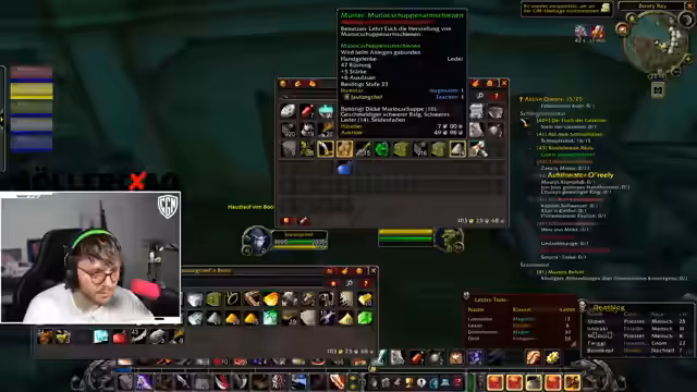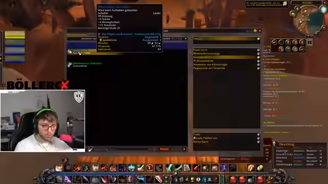 00:00:00Der Stream beginnt mit dem Streamer, der aktuelle Spielaktivitäten bespricht. Er sammelt verschiedene Questobjekte wie Kristallsplitter und Ohren, erwähnt das Farmen von Muschelfleisch für die Gildenbank und tauscht sich mit dem Chat über den Spielverlauf aus. Es werden auch Todesfälle im Freundeskreis, wie von Roni Zwerger, angesprochen und der Start des Streams als etwas unausgeglichen beschrieben.
