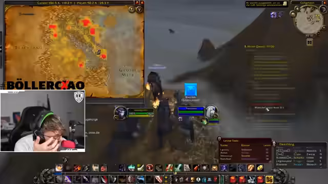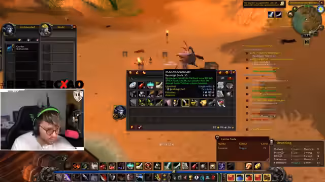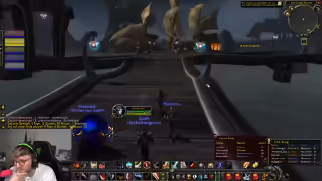 03:51:26Die Teilnehmer spielen zusammen im Gammeljäger, wobei einer die Schuld am Scheitern gab. Es wurde der Level 60-Zielstand in der Gruppe thematisiert. Die Gilde wurde vor Kurzem von einem Spieler erstellt, der angeblich den Hauptaccount aus kommerziellen Interessen betreibt. Ein Spieler holte kurzfristig sein Inventar und ein anderer fragte nach dem aktuellen Level. Es wurden Riesen-Nilpferde, Sprengfallen und der Weg nach Booty Bay für die nächste Mission besprochen.