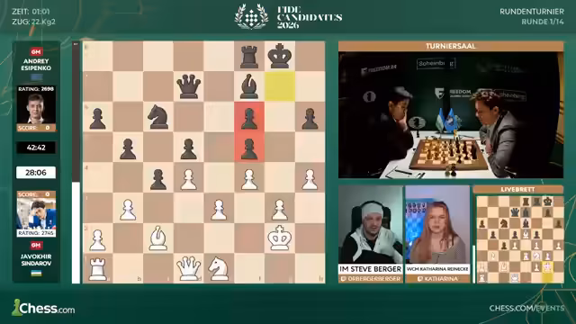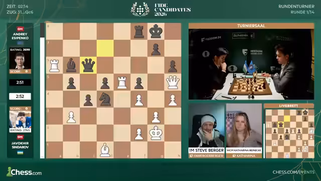 03:13:35Die Kommentatoren wechseln zu anderen Partien, besonders im Frauenkandidatenturnier. Sie beobachten, dass die Spieler oft unter Zeitdruck geraten, was die Entscheidungen erschwert. In der Männergruppe wird Ali Reza Sindarov als starker Geheimfavorit für das Turnier gehandelt. Er hat im vergangenen Jahr nur wenige Partien verloren und beeindruckt mit seiner Spielstärke und seinen Ressourcen in schwierigen Stellungen. Dennoch ist das erste Kandidatenturnier eine besondere Herausforderung, die selbst erfahrenen Spielern Sorgen bereiten kann.