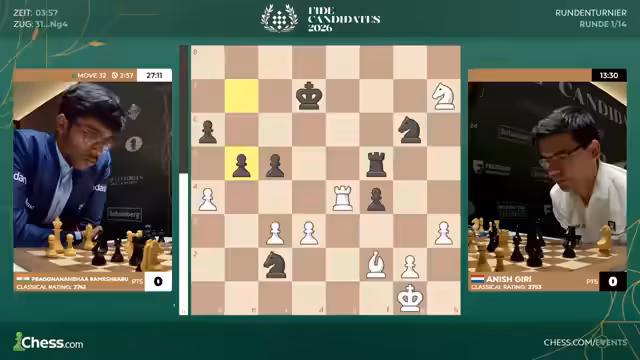 00:30:45Matthias Blübaum beginnt seine Partie gegen den bislang unerprobten Gegner Rameshbabu Praggnanandha mit dem erwarteten Zug D4. Er entwickelt sich solide mit Springer c3 und stellt den Springer auf d6 unter Druck. Gleichzeitig startet Fabiano Caruana gegen Hikaru Nakamura mit einem aggressiven Bauernopfer im Damenbauernspiel, was zu einer komplexen und taktisch anspruchsvollen Stellung führt. Die Kommentatoren sind gespannt, ob Praggnanandha, bekannt für kreative Eröffnungen, Blübaum aus der Reserve locken kann.