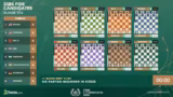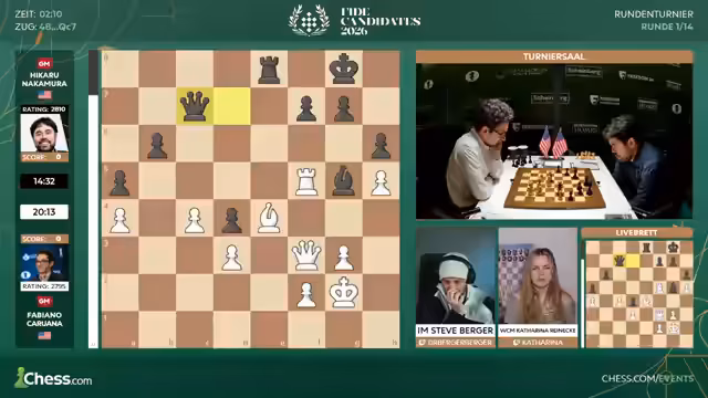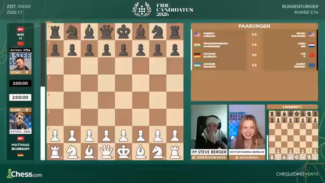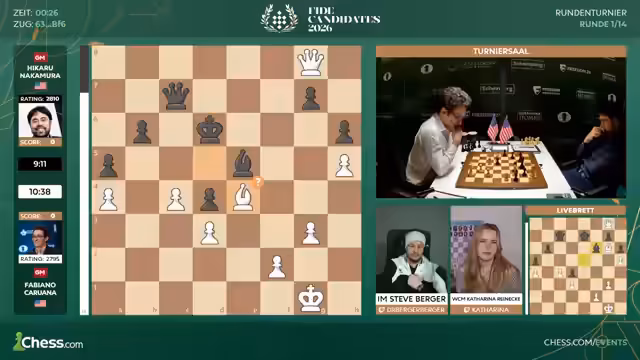 00:11:16Anna Musitschuk ist nach dem Ausfall einer Spielerin als Nachrückerin ins Frauenfeld aufgerückt. Die Paarungen der ersten Runde folgen der Regel, dass Spieler der gleichen Nationalität gegeneinander spielen müssen. Daraus ergeben sich Paarungen wie Hikaru Nakamura gegen Fabiano Caruana im offenen Turnier und Katharina Lagno gegen Alexandra Goriashkina bei den Frauen. Trotz zweier indischer Spielerinnen im Frauenfeld, Divya Deshmukh und Anna Musitschuk, spielen sie in der ersten Runde nicht gegeneinander, um eine spätere Paarung zu ermöglichen.
