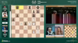 03:27:39In den Partien der Frauenkandidatinnen kommt es zu taktischen Ungenauigkeiten und scheinbar unverständlichen Zügen. Eine Spielerin lässt einen geschlagenen Läufer auf H5 stehen, anstatt ihn zu nehmen, was eine wichtige Figur preisgibt und den Gegner in Vorteil bringt. Die Kommentatoren sind sich uneinig über die Logik hinter diesem Zug und analysieren die sich daraus ergebenden Mattgefahren und Remischancen. Die Stellungen sind komplex und erfordern präzises Spiel unter Zeitdruck.