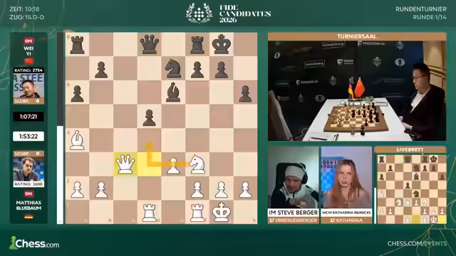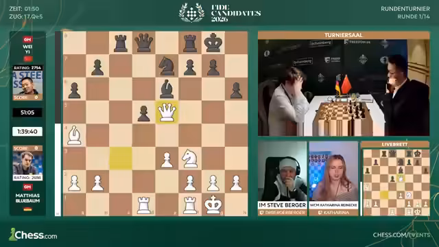 Im wichtigsten Turnier seiner Karriere startet Matthias Blübaum mit einer soliden Leistung. Er eröffnet mit D4 und entwickelt sich solide. Die Partie gegen den unorthodoxen Gegner wird komplex und ausgegogen. Nach eingehender Analyse bietet der deutsche Meister Remis an. Sein Gegner Yi Wenjie nimmt an. Es ist ein guter und respektvoller Start in das prestigeträchtige Turnier.