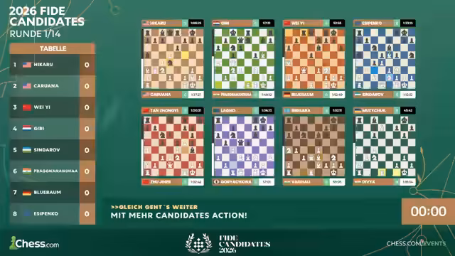 06:12:50Nach dem Ende der Partien wird eine Zusammenfassung der ersten Runde des Kandidatenturniers gegeben. Matthias Blübaum erzielte ein Remis und befindet sich damit im Mittelfeld. Gewinner des Tages sind Caruana und Praggnananda. Die Kommentatoren blicken auf den morgigen Start der zweiten Runde voraus, bei der Blübaum mit Schwarz gegen Sindarov antreten wird, und drücken ihm die Daumen.