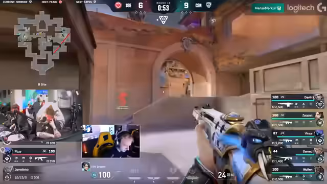 03:01:08Nachdem SGE die B-Seite erfolgreich verteidigt hat, kommt es zu einer 4-4-Situation. Die SGE zeigt sich in dieser Phase defensiv stark und kann die Angriffe von CGN abwehren. Währenddessen versucht CGN, mit aggresivem Spiel Druck aufzubauen. Kommentatoren preisen die stabile Verteidigungsleistung der SGE und geben ihnen noch eine kleine Chance auf ein Comeback. Das Spiel bleibt bis zum Ende umkämpft.