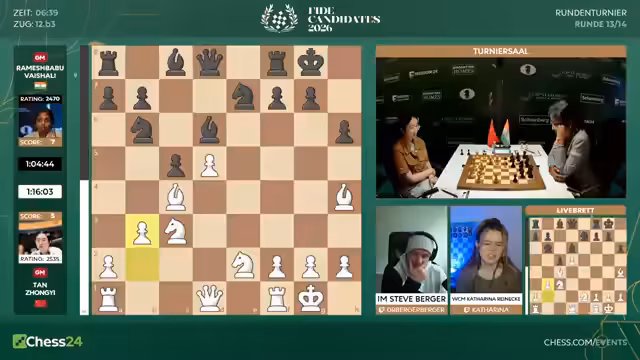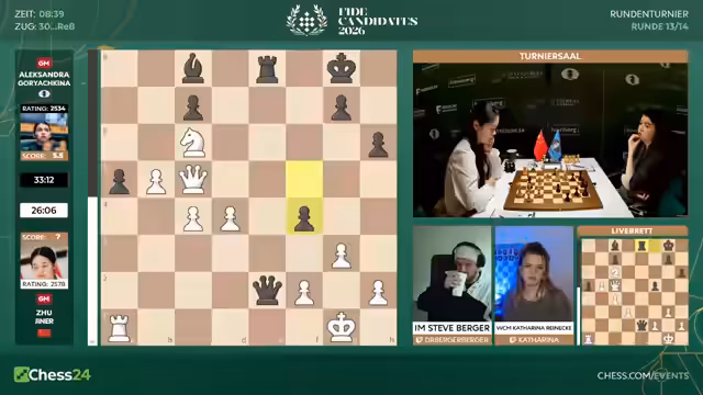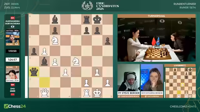 04:42:04Im Damenkandidatenturnier verliert Sujina eine vielversprechende Partie gegen Goryachkina trotz guter Ausgangsstellung. Sie hadert mit ihrer Entscheidung, nicht das Remis anzunehmen, und verliert schließlich nach einem taktischen Fehler. Ihre Konkurrentinnen Bibi Sarah und Charlie sind nun an der Spitze des Turniers, während Sujina auf den dritten Platz abrutscht. Die Konstellationen für die letzte Runde sind komplex: Wenn Sujina gewinnt und die anderen Verlierinnen, kann es theoretisch zu einem Fünfweg-Playoff kommen. Dies erhöht den Druck auf Sujina, die nun in einer Muss-Win-Situation für die Verlängerung steht.
