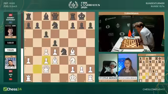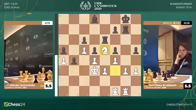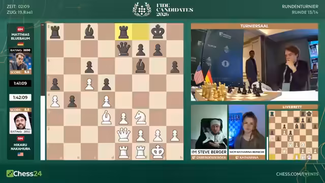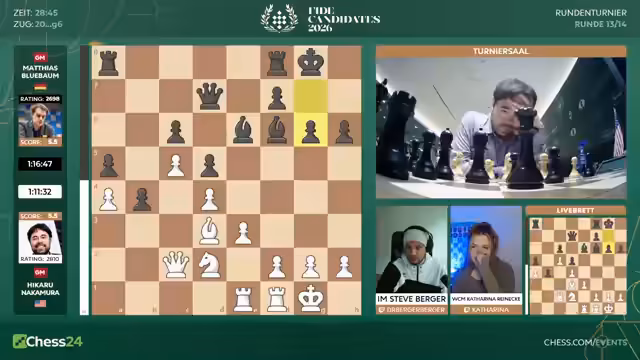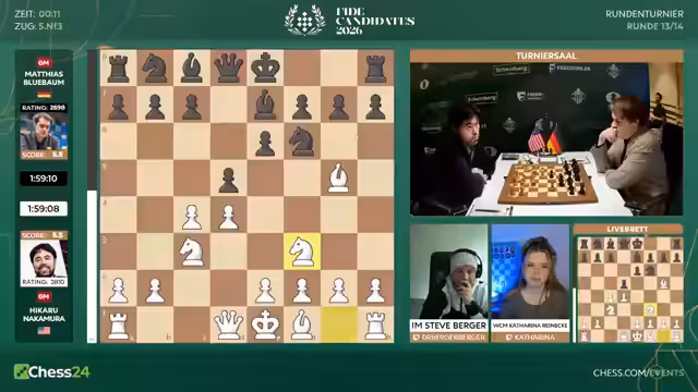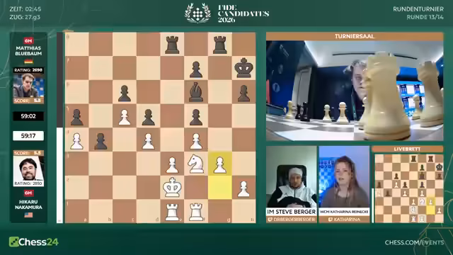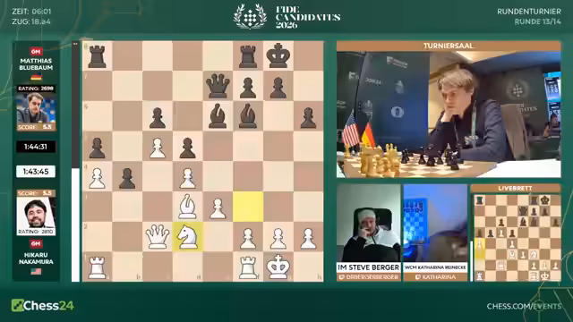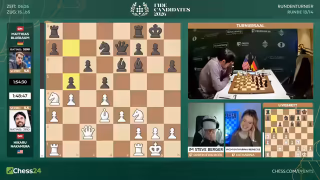 In der 13. Runde des Kandidatenturniers 2026 wurde das Duell zwischen Matthias Blübaum und Hikaru Nakamura als eines der spannendsten Partien des Turniers wahrgenommen. Blübaum konnte Nakamura mit den schwarzen Steinen überraschen, während Nakamura bei Weiß übertrieb. Es wurde über verschiedene strategische Entscheidungen diskutiert, die das Spiel beeinflussten. Beide Spieler haben noch gute Chancen auf das Podium und um die Preisgelder im Turnier.