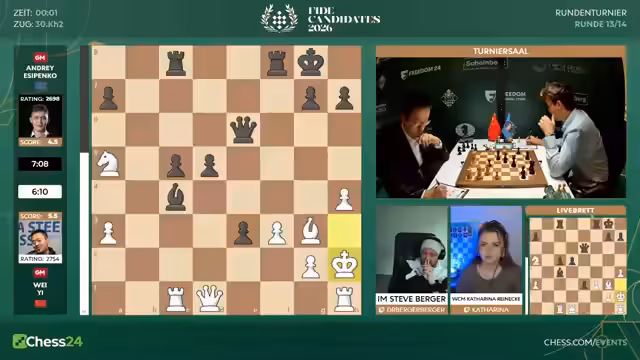 04:14:27In der Partie zwischen Wei Yi und Ysipenko befindet sich beide Spieler in Zeitnot, wobei Yi im 30. Zug noch viele Züge zu absolvieren hat. Yi zeigt beeindruckende Nervenstärke, indem er trotz Zeitdruck die beste Strategie verfolgt. Er entscheidet sich für Springer B3 anstelle der Zugwiederholung, was als kluge Entscheidung gilt. Ysipenko, der ebenfalls in Zeitnot geraten ist, bietet die Zugwiederholung an, was als taktische Maßnahme zur Zeitverwaltung interpretiert werden kann. Die Partie bleibt äußerst spannend, da beide Spieler unter Zeitdruck wichtige Entscheidungen treffen müssen.