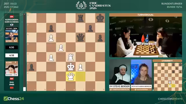 03:17:59Bei den Frauen zeigt sich eine spannende Entwicklung. Bibi Sara gewinnt ihre Partie gegen Katharina Lagno und überholt damit Charlene auf den zweiten Platz mit 7,5 Punkten. Die Partie wurde als ungleichfarbiges Läuferendspiel mit einem besonders taktischen Charakter analysiert. Bibi Sara nutzte geschickt die schwache schwarze Königsstellung und konnte durch einen Bauernvorstoß gewinnen. Sie hat nun beste Chancen, das Frauenkandidatenturnier zu gewinnen, nachdem sie in den letzten Runden zweimal hintereinander gewinnen konnte.