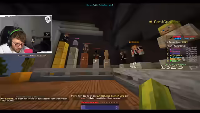 01:56:37Nach einem weiteren erfolgreichen Dropper-Durchgang, bei dem er Zweiter wird, zeigt sich der Streamer extrem selbstbewusst und ambitionsreich. Er verkündet, dass sein Team das Turnier gewinnen werde und droht damit, Kevin in Köln eine 'reinzuholen', falls sie den Dropler-Modus verlieren. Seine Konkurrenz besteht aus vielen jungen, als sehr talentiert geltenden Spielern. Gleichzeitig erwähnt er, als 30-jähriger YouTuber eine besondere Rolle auf dem Server einzunehmen, da viele Zuschauer ihn kennen und er mit seinem Melonen-Golem-Skin auffällt. Seine Kommentare sind oft provokant und humorvoll, um sich und sein Team zu motivieren.