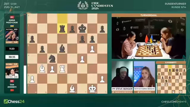 01:23:48Der Fokus wechselt zu anderen wichtigen Partien des Kandidatenturniers. Kommentator analysiert das Duell zwischen Svetlana Stefanova und Divya Deshmukh, die beide 4,5 Punkte haben, sowie das Aufeinandertreffen von Zhansaya Abdumalik und Kateryna Lachno. Beide Partien werden als sehr wichtig für die Spitzengruppe angesehen. Bei Lachno wird ihre bislang mäßige Leistung kritisiert, während bei Abdumalik ihre starke Spielweise hervorgehoben wird, selbst wenn sie in der Vergangenheit einige Glücksfälle hatte.