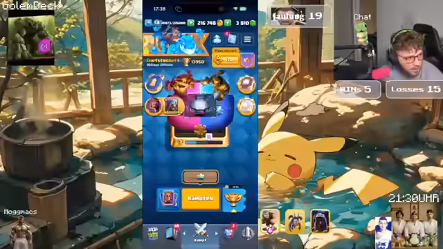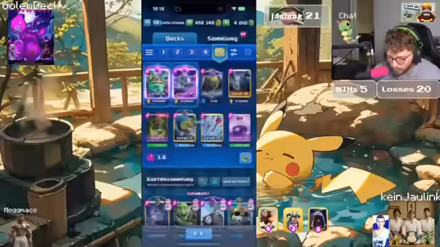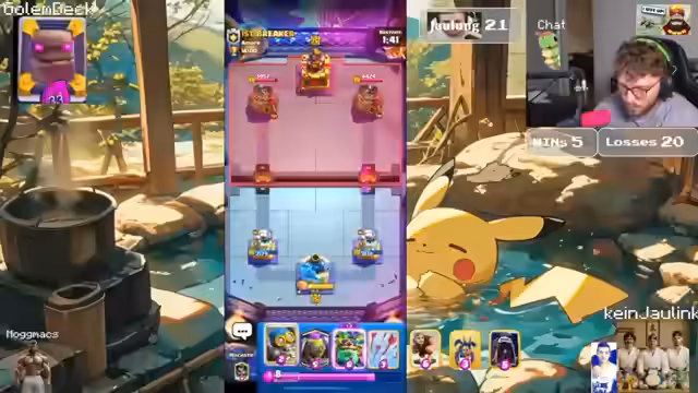 00:00:42Der Stream beginnt mit dem Streamer, der sich etwas von einer Tour ausgeruht, aber nicht ganz fit fühlt. Er klärt, dass heute kein Jaulinger stattfindet, da Max aus persönlichen Gründen drei Tage weg ist und sich mit seiner Freundin verabredet hat. Ziel des Streams ist es, die 15.000 Trophäenmarke zu erreichen, wobei der Streamer von den häufig gespielten Lockbait-Decks und dem Meta-Deck mit Mega-Ritter und Rakete frustriert ist, da er ihm kaum eine Gewinnchance gibt.