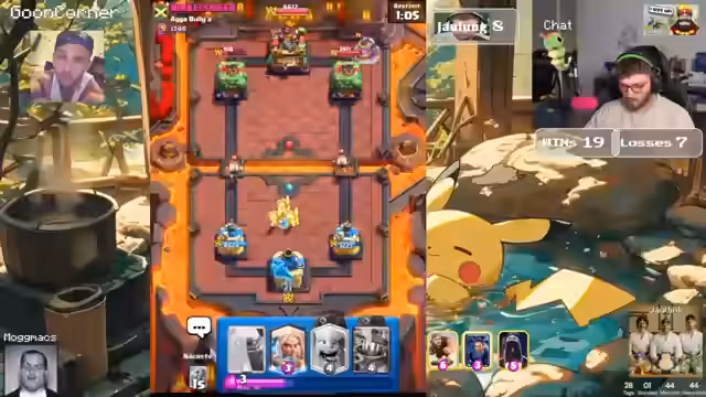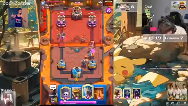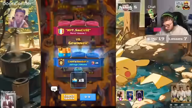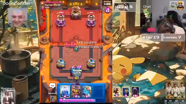 00:00:46Der Stream beginnt als Dual-Stream auf Twitch und TikTok, ein neues Format für den Streamer. Die Ziele für den Stream sind klar definiert: Das Pokémon-Smaragd-Adventure soll fortgesetzt werden, und im Clash Royale möchte der Streamer über 2000 Trophäen erreichen. Ein wichtiger Punkt ist auch die Ankündigung eines Duells, bei dem es darum geht, als erster zweimal zwölf Siege im Megadraft zu erreichen. Nach einem anfänglichen Verlust im ersten Spiel betont der Streamer den Willen, durchzuziehen und die Ziele zu erreichen.