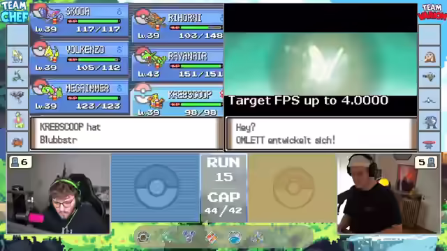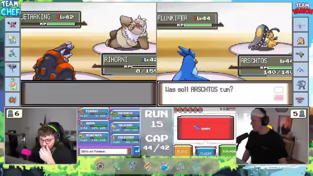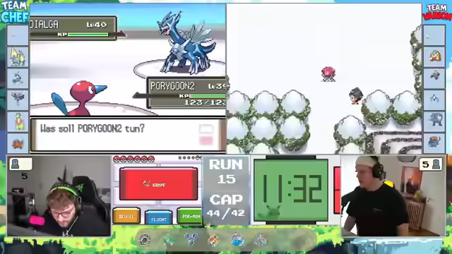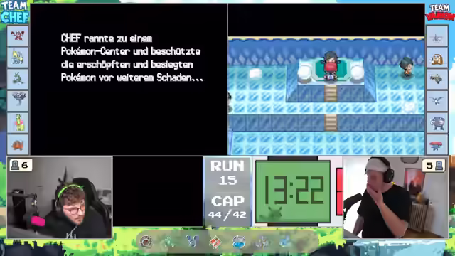 01:31:44Der Streamer erklärt, dass es nicht verboten ist, einen Emulator herunterzuladen, wenn man die Spiele physisch besitzt, aber er darf nicht sagen, wo man Roms bekommt. Der Kalender öffnet sich ungewollt und der Streamer hasst seinen PC dafür. Der Explorer wird neu gestartet, aber der Taskmanager hängt sich auf. Der Streamer fragt den Chat um Hilfe. Es wird überlegt, ob Eiszahn gegen einen Gegner eingesetzt werden soll, der Aurasphäre hat. Der Streamer entscheidet sich für Arctos. Der Taskmanager hängt sich weiterhin auf und der Streamer kann nichts mehr anklicken. Er schafft es, das Problem zu beheben, ohne den PC neu zu starten. Es wird überlegt, ob man mit Skorgro lieben soll, um zu feeden. Der Streamer hat ein Standbild und muss die Verbindung neu herstellen. Er hat Schiss vor dem nächsten Kampf, aber er ist vorbereitet und will zusammen mit dem Chat gewinnen. Es wird überlegt, wem man eine Beere geben soll. Der Streamer geht in den Mode-Only-Modus und hofft auf Unterstützung. Es wird überlegt, ob man gegen Frieda kämpfen soll. Roselia wird als gefährlich angesehen, da der Streamer eine Pflanzenschwäche hat. Angeberei wird als problematische Attacke angesehen und der Streamer überlegt, Arctos einzusetzen.