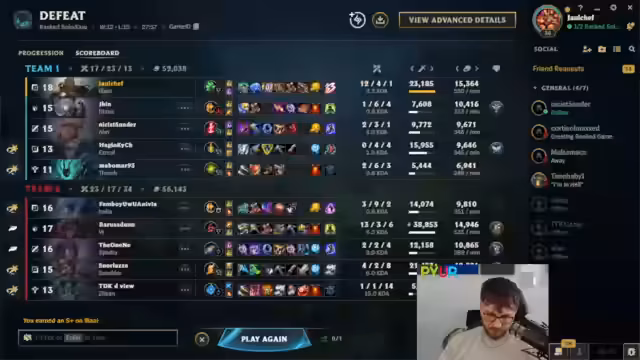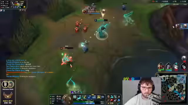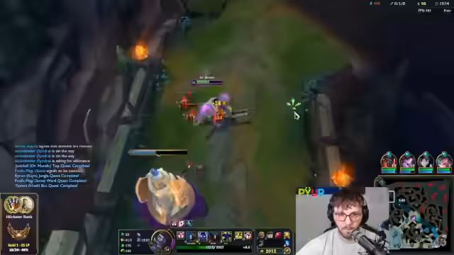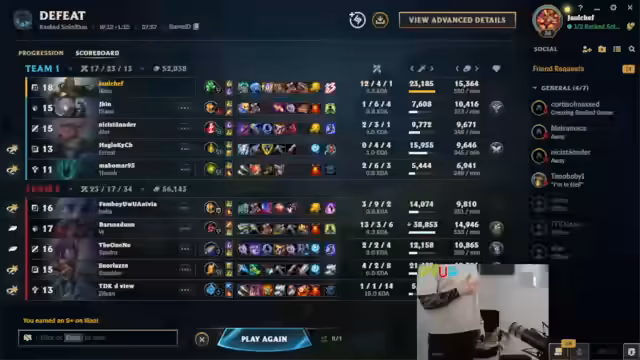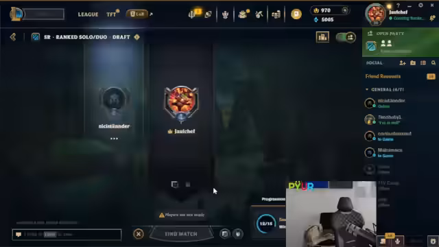 12:59:59Später im Spiel kämpft die eigene Seite gegen einen extrem gefederten Jhin, während der eigene Jungle, ein Kai'Sa, im Late-Game als unterlegen beschrieben wird. Der Streamer äußert massive Frustration über das System, da er von mehreren Gegnern als Smurf identifiziert wird und der Verdacht besteht, dass künstlich aufgebaute, hochkarätige Duo-Lobbys gegen sie platziert werden, was ein faires Spiel unmöglich macht.
