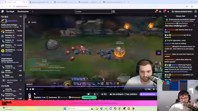 06:00:26Während des Spiels kritisiert der Streamer die Leistung seines Teams, besonders die Bot-Lane, die seiner Meinung nach nicht effektiv spielt. Er ist frustriert über die fehlende Kommunikation und die schlechten Entscheidungen in Teamfights. Der Streamer betont, dass er selbst sich verbessern müsse, aber gleichzeitig das Team mehr Zusammenarbeit benötige, um die Spiele zu gewinnen. Die Stimmung ist angespannt, und der Streamer versucht, das Team aufzurütteln und motiviert zu halten.