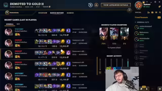 09:55:52Der Streamer analysiert seine eigenen Statistiken und den plötzlichen Abstieg in niedrigere Eloboni. Nach einer 4er Losing-Streak und mehreren Niederlagen gegen qualitativ überlegene Gegner hinterfragt er seine eigene Spielstärke und das allgemeine Niveau seiner Mitspieler. Er stellt seine Entscheidung, weiterhin zu spielen, infrage, obwohl er frustriert ist. Die Stimmung ist geprägt von Selbstzweifeln und der Frage nach der Sinnhaftigkeit des aktuellen Spiels und seiner Teams.