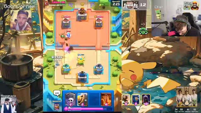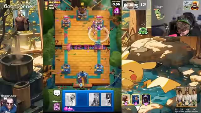 00:00:00Der Stream beginnt mit lauter Begrüßungen im Chat. Der Streamer präsentiert einen verbesserten Sound und erwähnt zwei Intrigode. Er überlegt, ob er den Bomber und die Bubskan mitnehmen soll und erhält einen Lucky Drop, den er bis Level 4 ausbauen möchte. Er berichtet von seiner Grand Challenge und plant, die Belohnungen erst in der nächsten Arena zu öffnen. Nach dem Öffnen der Belohnungen beginnt er mit dem Ranked-Grind und spielt gegen einen Gegner, der ein Deck mit Freeze, Elite-Webbar und einem zufälligen Card-Stack verwendet.