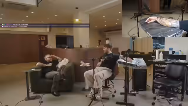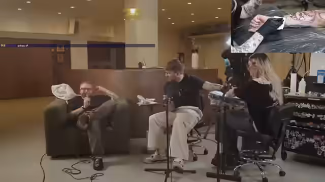00:08:53Ein Schwerpunkt des Gesprächs ist der Tattoo-Prozess und die dazugehörigen Erfahrungen. Es werden die notwendigen Schritte erklärt, von der Anfrage auf der Webseite bis zur Abrechnung in 'Tagessitzungen'. Der Streamer und Mary sprechen über die Schmerzen beim Tätowieren und nennen besonders den Hinterkopf, die Kniekehle und die Achselhöhle als sehr ekelhafte Stellen. Die Sitzung dauert sieben Stunden, wobei das Auftragen des Abziehbibilds zwei Stunden in Anspruch nahm.