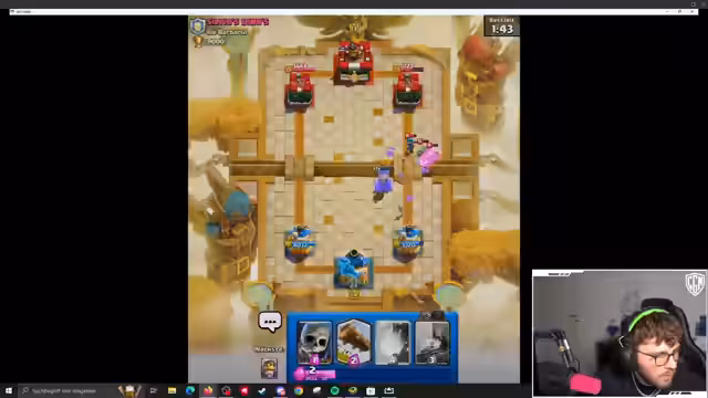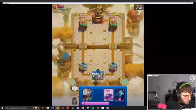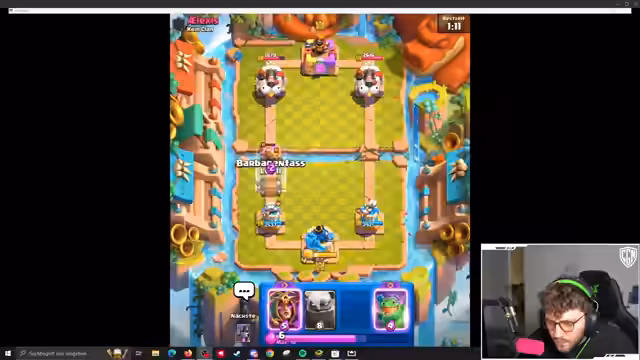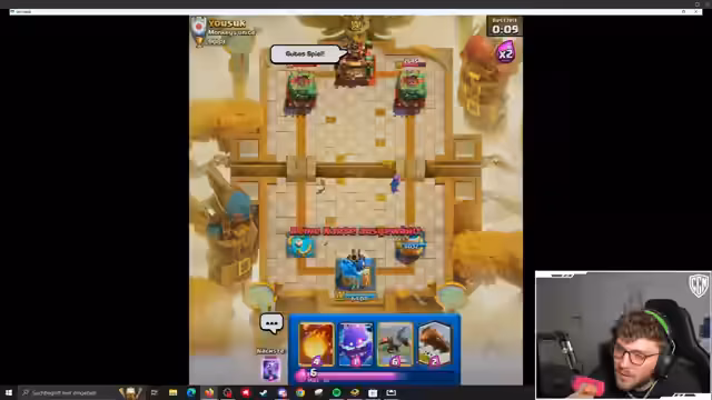 00:49:37Zu Beginn des Streamsabschnitts liegt der Fokus auf dem kontinuierlichen Golemspelen, insbesondere auf der linken Lane, um gegnerische Prinzen zu blockieren und zu verhindern, dass diese freie Kronen erhalten. Der Streamer analysiert wiederholt ungeschickte Spielzüge und verpasste Gelegenheiten, wie das zu späte Spielen von Karten oder das Fehlen von Schadenszaubern, was zu unnötigen Turmverlusten führt. Die ständigen Aufforderungen, zu pushen, zu verteidigen und spezielle Karten wie den Babydrache oder die Hexe zu platzieren, unterstreichen die zentrale Herausforderung des Spiels: das schnelle und präzise Reagieren auf die Gegnerzüge und das Vermeiden von Overcommitments.
