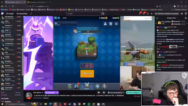 04:53:00Ein schwerwiegender technischer Vorfall ereignet sich, als der Streamer plötzlich auf einem falschen, niedrig levelten Account in Clash Royale eingeloggt ist. Panik entsteht, da der eigentliche Account mit sämtlichen Käufen und Fortschängen verschwunden zu sein scheint. Die Ursache ist eine fehlerhafte Verknüpfung der Supercell-ID. Gemeinsam mit dem Chat wird die Fehlerbehebung erörtert, die das Erstellen einer neuen E-Mail-Adresse für die Account-Wiederherstellung erfordert.