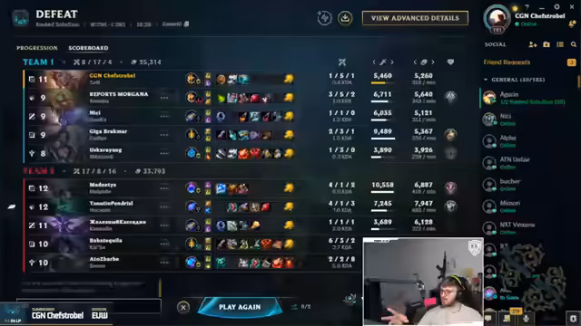 13:15:56Nach zahlreichen Niederlagen, hauptsächlich aufgrund der schwachen Bot-Lanes, reflektiert der Streamer die aktuelle Situation. Er ist frustriert, aber auch erschöpft und findet die Lage lächerlich. Er stellt eine hypothetische Frage in den Raum, wie viel er für eine ausgewogene Bot-Lane zahlen würde, und bekräftigt, dass er alles für faire Spiele geben würde. Das endet mit einem letzten vergeblichen Versuch, das Spiel noch zu wenden, was jedoch scheitert.