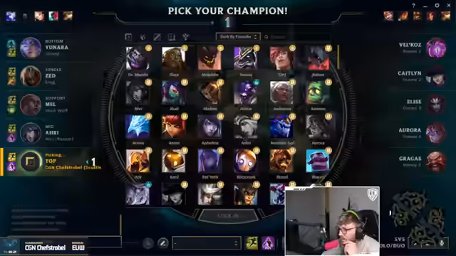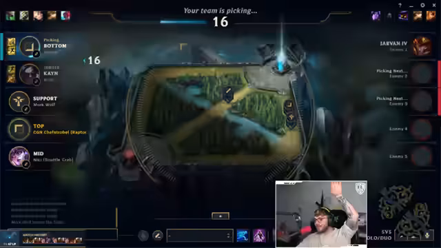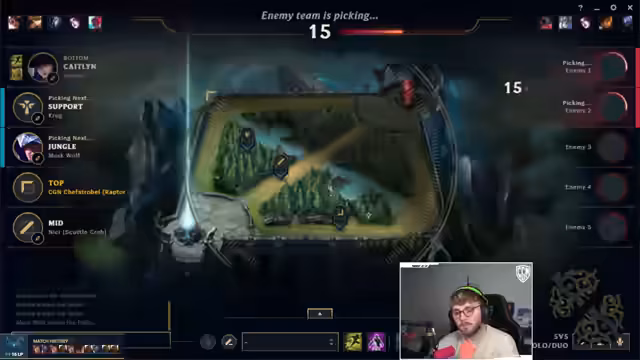15:05:05Bei der Champions-Wahl gibt es Unsicherheit über den gegnerischen Pick. Der Streamer mutmaßt über den gegnerischen Vigo, ob er bestimmte Builds spielt, und entscheidet sich selbst für einen riskanten, offensiven Spielstil. Er ist sich bewusst, dass er nicht zu greedy spielen darf, greift aber trotzdem aggressiv an und macht dabei Fehler, die ihn in Bedrängnis bringen.