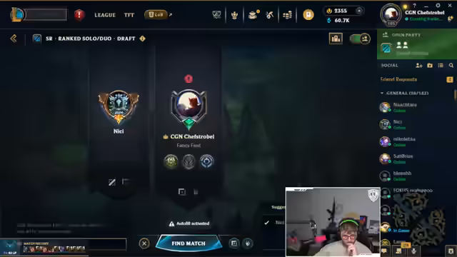15:52:30Nach dem Sieg reflektieren die Spieler den Fortschritt in der Challenge. Sie stellen fest, dass ihre Winning Streak trotz guter Leistungen zu weniger LP-Gewinn führt, was sie verwirrt. Sie diskutieren die Ungereimtheiten des Ranglistensystems und die steigende mentale Belastung. Dennoch sind sie motiviert und planen, weiterzumachen, solange die Chance besteht, ihr Ziel zu erreichen.
