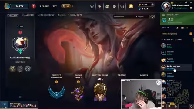 10:56:05Der Streamer erwähnt ein vorheriges Spiel mit einem Spieler namens Albert Epstein, der getrollt hat, und beobachtet, wie sich das aktuelle Spiel zu einem brutalen Stomp entwickelt. Gleichzeitig wird die aktuelle Ranglistenposition angesprochen: Der Streamer ist in Gold 2 mit 99 LP und muss in den nächsten Spielen gewinnen, um die Zielplatine zu erreichen und für die Kings League bereit zu sein.