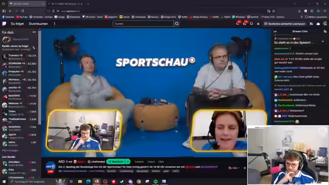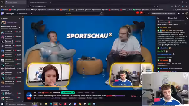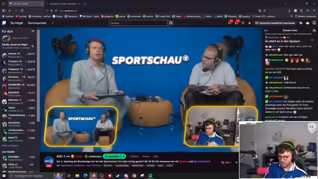 03:51:20Die Sportschau-Präsentation wird um eine interaktive Komponente erweitert. Es wird eine Doku über Schiedsrichter mit Bodycam-Szenen vorgestellt, bei denen das Publikum gemeinsam über fiktive Fouls urteilen muss. Der Streamer und Henke analysieren gemeinsam mit dem Chat die Entscheidungen eines Schiedsrichters und diskutieren die Korrektheit von Gelb- und Rot-Karten, was zu einer spannenden interaktiven Session wird.