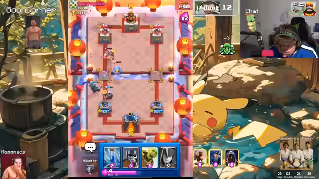 05:40:02Nach der Halbzeitpause wechselt der Streamer zum Spiel Clash Royale. Er kommentiert sein Spiel live, analysiert seine Karten und Deck-Wahl kritisch, seine Platzierung im Spiel und die Karten, die er aus den Kisten zieht. Es ist ein rein fokussiertes Gameplay, bei dem er seine Strategien und Enttäuschungen über spielerische Entscheidungen des Gegners teilt.