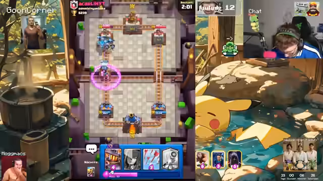 00:09:45Der Streamer wechselt kurz zum Spiel Clash Royale, in dem er und sein Team Boris in einem kampfintensiven Spiel unterwegs sind. Es besteht die Absicht, einen Podcast bei Spotify zu starten und umzusetzen, da eine früheres Podcast-Projekt während der Coronazeit eine hohe Reichweite hatte. Zudem erwähnt er eine mögliche Zusammenarbeit für ein Pokémon-Programm, das jedoch noch nicht final ist.