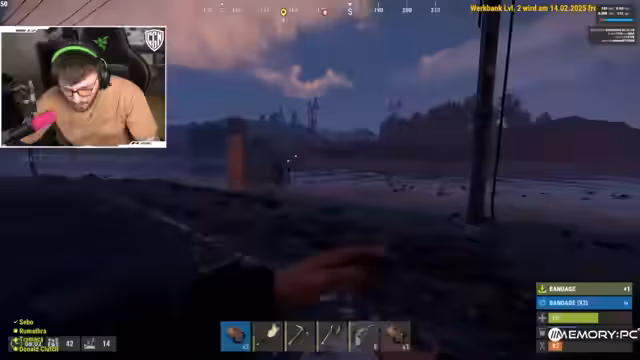 02:02:08Der Streamer äußert die Befürchtung, erneut zu sterben, und fragt nach, wie Hanf aussieht. Er erinnert sich an frühere Rust-Sessions, in denen er und seine Mitspieler stundenlang Hanf farmten und genetisch kombinierten. Er hat Schwierigkeiten, Hanf in der aktuellen Umgebung zu erkennen. Er betont die Notwendigkeit, schnell 50 Hanf zu sammeln, um Kleidung herzustellen und sich vor anderen Spielern zu schützen. Der Streamer plant, einen Bogen zu craften, um sich gegen Naked-Angriffe zu verteidigen. Er erkennt, dass das Wirkband Level 2 erst in einer Woche freigeschaltet wird. Er hat Angst, beim Looten zu sterben und fragt sich, wie er einen Bogen craften kann. Er betont, dass er Holz benötigt und fragt, ob seine Mitspieler bereits am vereinbarten Treffpunkt sind. Der Streamer wiederholt den Treffpunkt: E6, F6, in der Nähe des Flusses.